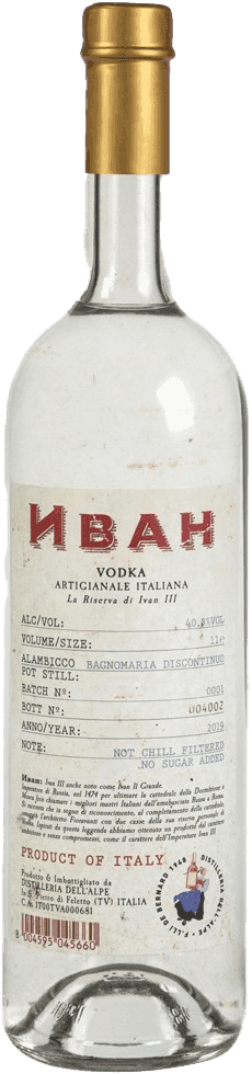 Ivan Vodka, una vera vodka italiana artigianale. Prodotta da Distilleria Dell’Alpe in numero limitato, senza l'aggiunta di zuccheri e distillata a bagnomaria per la valorizzazione e il rispetto della materia prima, esaltandone gli aromi.